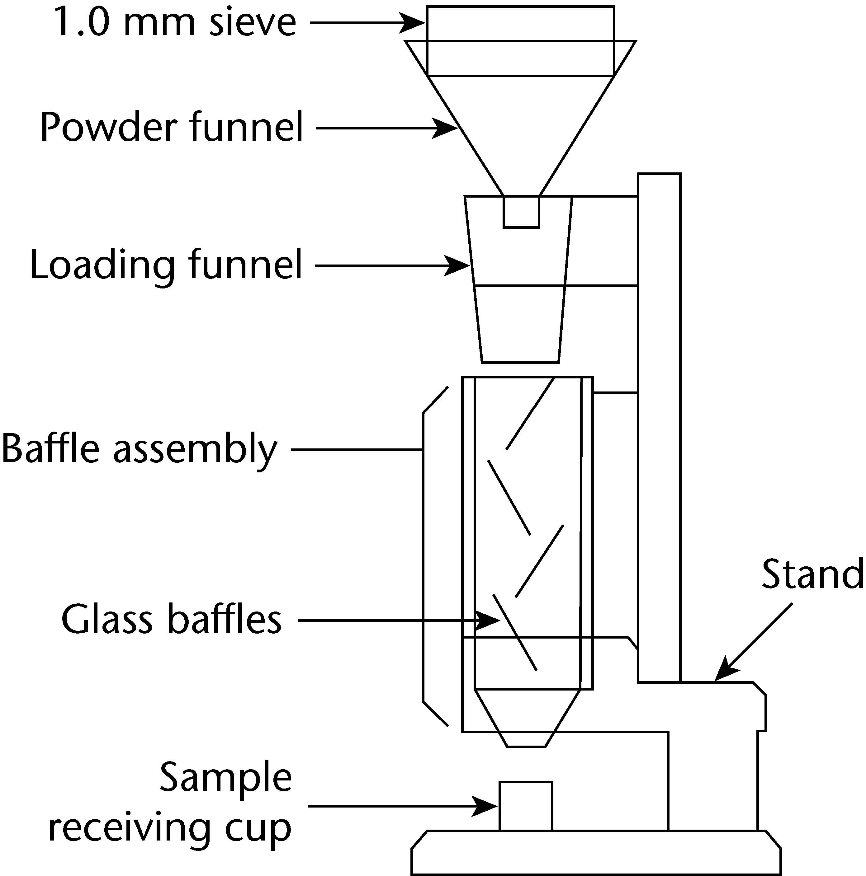 Apparatus—The apparatus consists of a top funnel fitted with a 1.0-mm sieve.1 The funnel is mounted over a baffle box containing four glass baffle plates over which the powder slides and bounces as it passes. At the bottom of the baffle box is a funnel that collects the pow-der and allows it to pour into a cup of specified capacity mounted directly below it. The cup may be cylindrical (25.00 ± 0.05 mL volume with an inside diameter of 30.0 ± 2.00 mm)