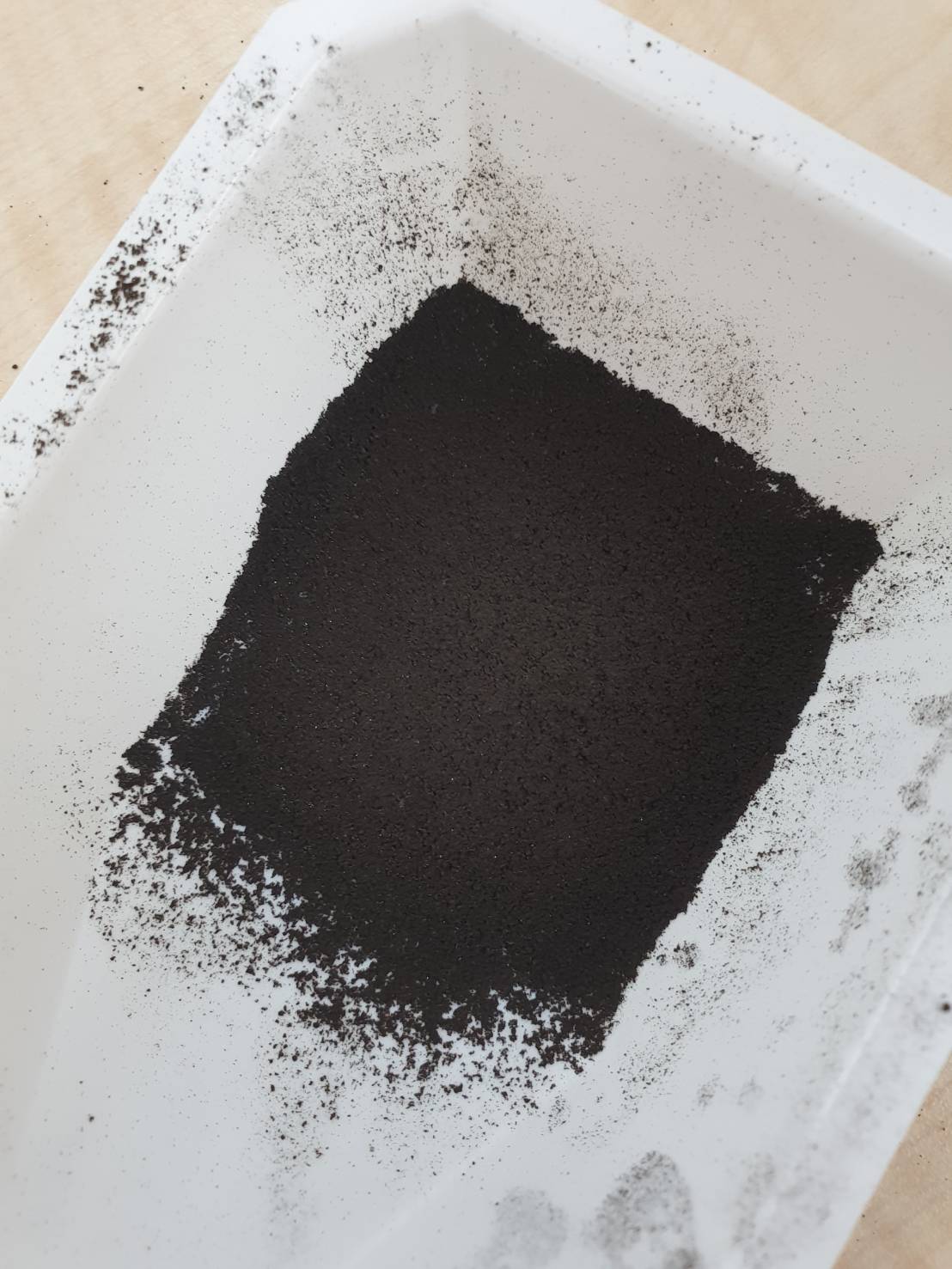 樣品敘述 : 樣品為黑色的三氧化二鐵,肉眼可視其顆粒大小不一,且可能容易吸濕造成團聚,甚至肉眼可視約mm等級以上的
